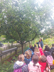 Au potager, nous avons vu des potirons, des vignes, des pommiers, et plein d'autres choses. On a vu le compost, des insectes et des plantes : de l'origan, du romarin, du persil. Nous sommes allés voir des ruches d'abeilles de loin. Nous avons fait le carnet à l'école et nous avons mangé des pommes du potager.